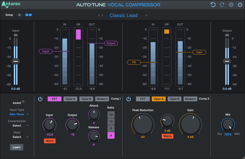 Versatile stereo compressor emulating Opto, FET, and Vari Mu characteristics