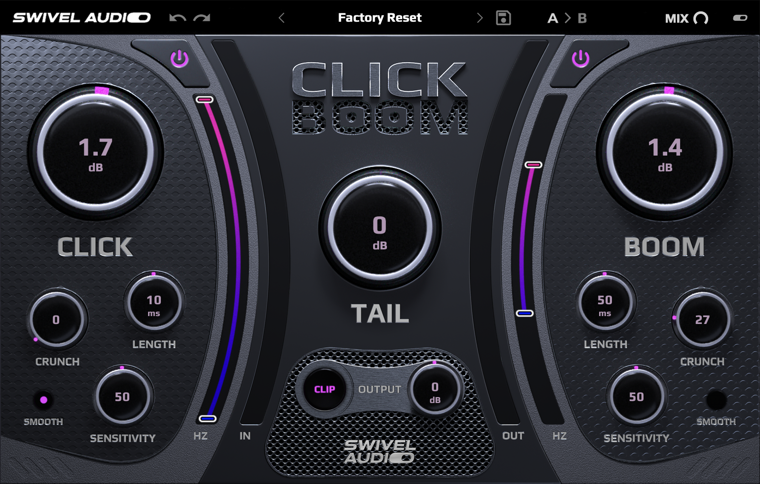 Click Boom is an incredibly powerful transient shaper designed to help you maximize and fine tune the impact and loudness of your tracks. Exactly as its name suggests, Click Boom gives you independent control over both the high “clicky” transients, and the low “boomy” transients in your sounds, ensuring you can sculpt each sound that much further and more precisely before incurring unwanted side effects. Click Boom was designed with producers in mind, with a simple and easy to use UI, and creato