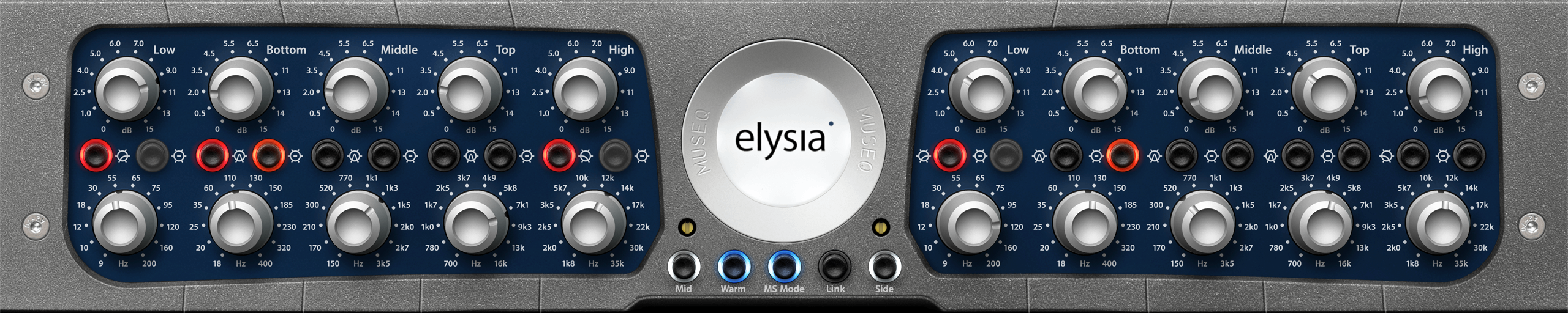 EQ with a clean, musical character The original hardware museq from elysia used the highest quality analog components and optimally designed parameters to deliver a premium sound shaping experience. One of those rare EQs that is almost impossible to get anything but a good sound out of, whether in the default transparent mode, or its even smoother “Warm” mode. Intuitive operation with plenty of flexibility Each channel of museq offers three parametric bands along with high and low shelves that c