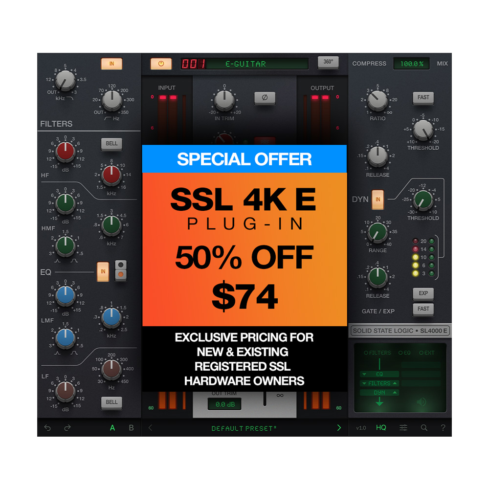 The SSL 4K E Channel Strip plug-in faithfully recreates the iconic SSL 4000 E Series console channel, which powered more Platinum-selling records than any other console. Introduced in 1979, the 4000 E is known for its bold, punchy character and incredible dynamics. Features the Type E 242 'black knob' and 001 'brown knob' four-band EQ modes, delivering aggressive, sharp tones or smoother vintage character. The complete channel includes EQ, filters, dynamics, and the signature SSL sound that adds punch to drums, presence to vocals, and heft to bass.