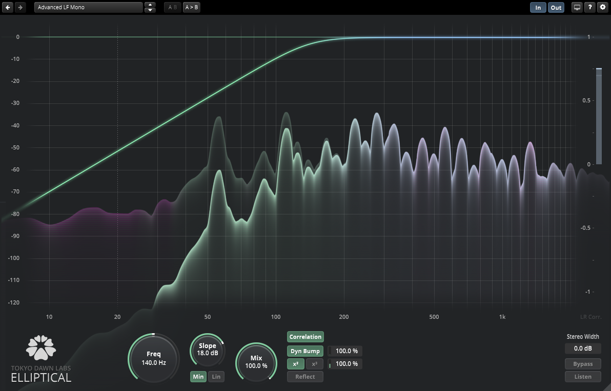 TDR Elliptical's specialty is control over stereo width at low frequencies, employing a pair of elliptical filters that operate on the stereo difference channel. They offer a continuously variable slope and give users a choice of either minimum or linear phase operation. Compensation tools include a Dynamic Bump function joined by Haas delay options.