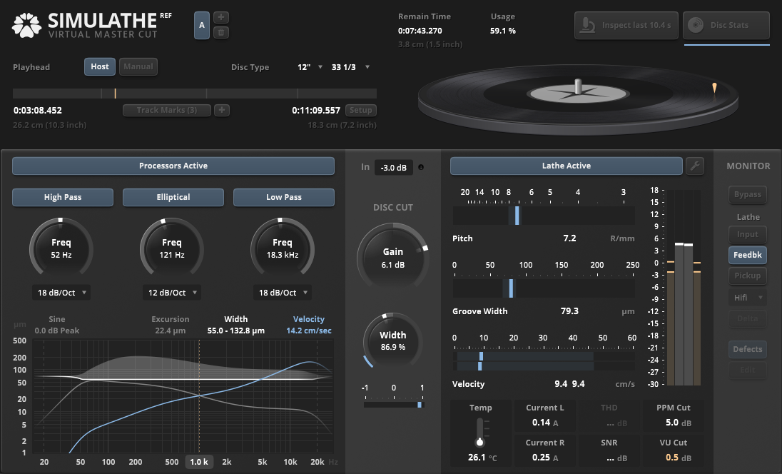 TDR SimuLathe REF is a complete simulation of the disk mastering process. With its specialized preprocessors, a precise virtual disk cutting lathe (four representative configurations), several turntable pickup models and extensive means of metering/analysis, this audio plugin offers hands-on insight into disk cutting. Intended primarily for educational and referencing purposes.